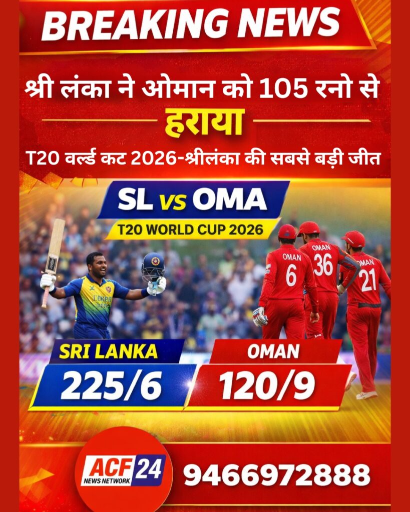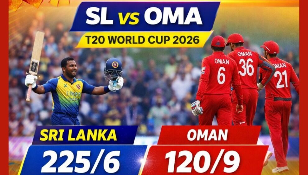 आईसीसी मेंस टी20 वर्ल्ड कप 2026 के ग्रुप-बी मुकाबले में श्रीलंका ने ओमान पर 105 रनों की शानदार जीत दर्ज करते हुए टूर्नामेंट में अपनी मजबूत दावेदारी पेश कर दी है। पल्लेकेले इंटरनेशनल क्रिकेट स्टेडियम में खेले गए इस मुकाबले में श्रीलंका ने पहले बल्लेबाजी करते हुए 225/6 का विशाल स्कोर खड़ा किया। जवाब में ओमान की टीम 20 ओवर में 120/9 रन ही बना सकी।